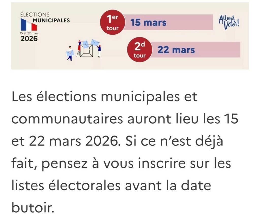 Les 15 et 22 mars 2026, vous allez vous rendre aux urnes pour élire les conseillers municipaux et communautaires. Vous pouvez dès maintenant vérifier que vous êtes bien inscrit sur les listes électorales. Si ce n’est pas le cas, vous devez effectuer cette démarche :